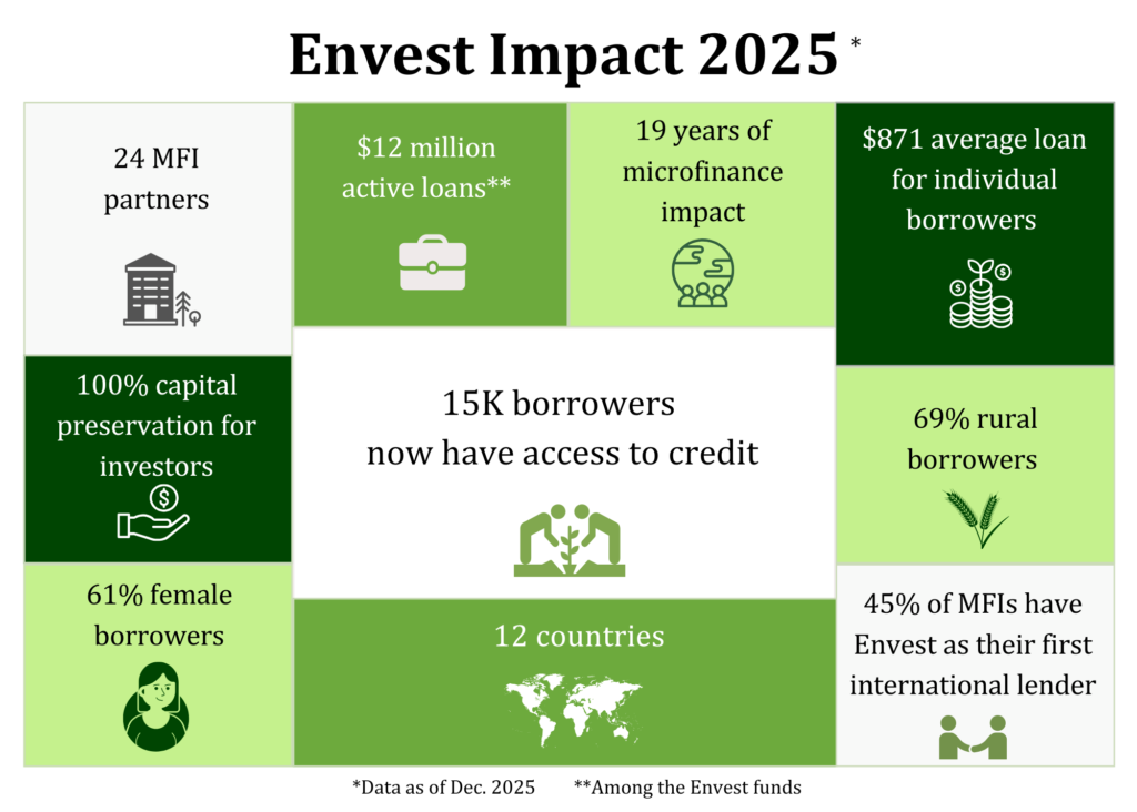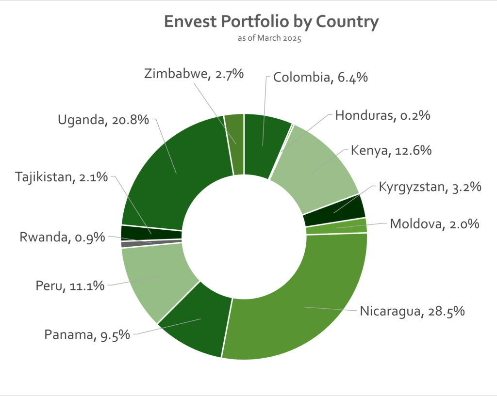Our portfolio is diversified across 23 carefully selected partner MFls in countries where there is limited access to credit. For about half of our partners Envest was the first foreign creditor to provide them with a much-needed infusion of cash in their local communities.